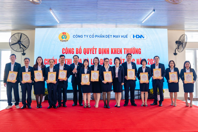 Ông Nguyễn Tiến Hậu – Bí thư Đảng ủy, Chủ tịch Công đoàn Công ty cho biết: “Năm 2024, Công ty Cổ phần Dệt May Huế vượt qua nhiều thách thức, duy trì việc làm, thu nhập ổn định cho người lao động và hoàn thành vượt mức kế hoạch đề ra. Các hoạt động chăm lo đời sống được Công đoàn Công ty quan tâm, nổi bật với “Tết Sum vầy” và Phiên chợ Nghĩa tình hỗ trợ 10.000 suất quà Tết, 145 lao động khó khăn nhận quà giá trị, 5 chuyến xe nghĩa tình đưa hơn 200 CBCNV về quê, tổ chức sinh nhật cho 4.300 lao động, và khen thưởng hơn 1.300 con CBCNV có thành tích học tập xuất sắc. Phong trào thi đua đạt nhiều thành tích ấn tượng: 16 sáng kiến đạt giải tại Ngày hội Lao động Sáng tạo, các giải thưởng trong Tháng Công nhân, Tháng ATVSLĐ, và Hội diễn Văn nghệ ngành. Công đoàn được khen thưởng vì học tập và làm theo tư tưởng Hồ Chí Minh, Chủ tịch Công đoàn vinh dự nhận Giải thưởng Nguyễn Văn Linh, cùng nhiều hoạt động tôn vinh lao động nữ và hỗ trợ kịp thời người lao động bị ảnh hưởng bởi thiên tai.” Thỏa ước lao động tập thể năm 2025 với nhiều điều khoản có lợi hơn cho người lao động đã được thông qua, thể hiện rõ cam kết của công ty trong việc đặt con người làm trung tâm.