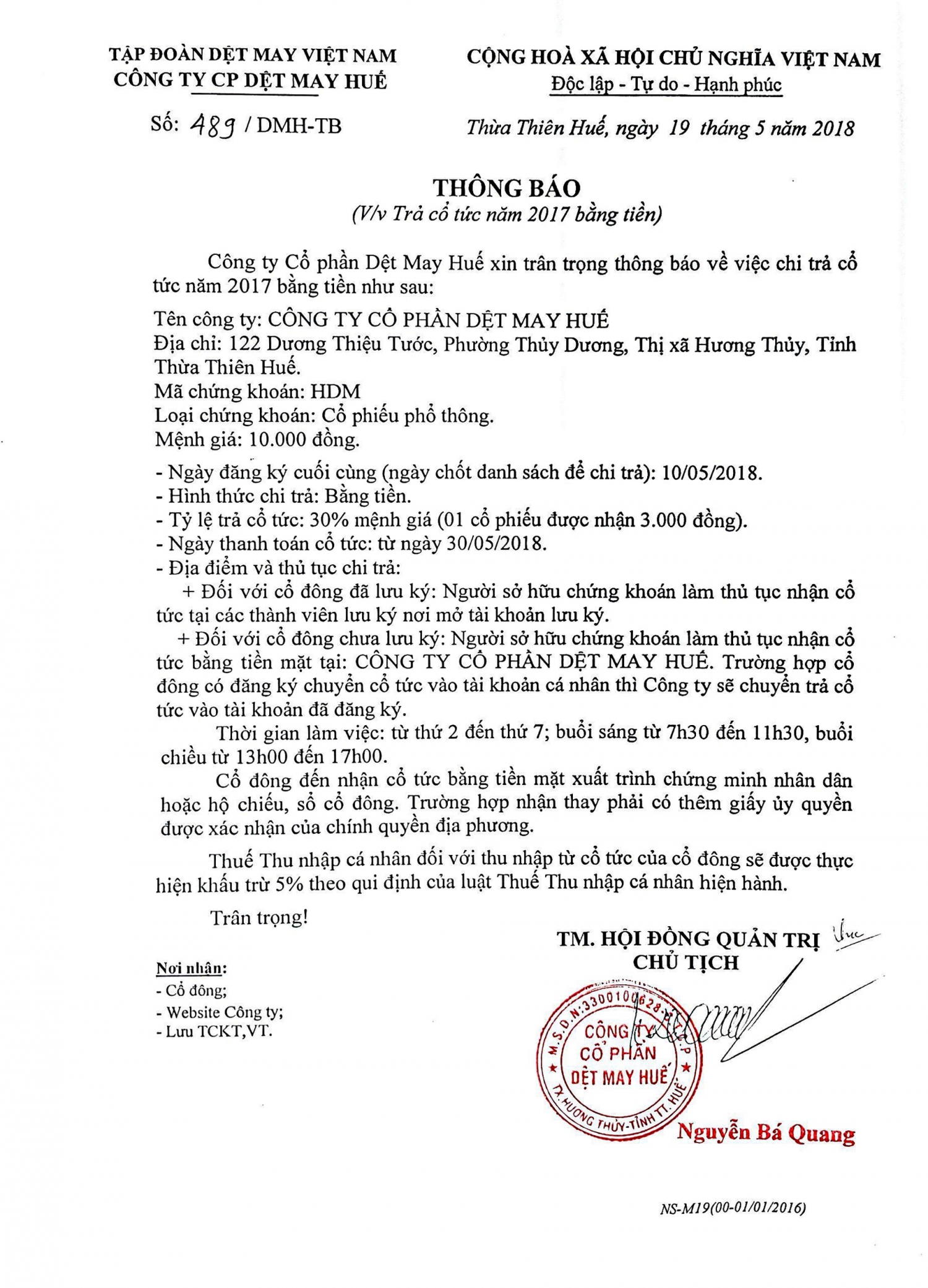 Công ty CP Dệt May Huế xin trân trọng thông báo về việc chi trả cổ tức năm 2017
