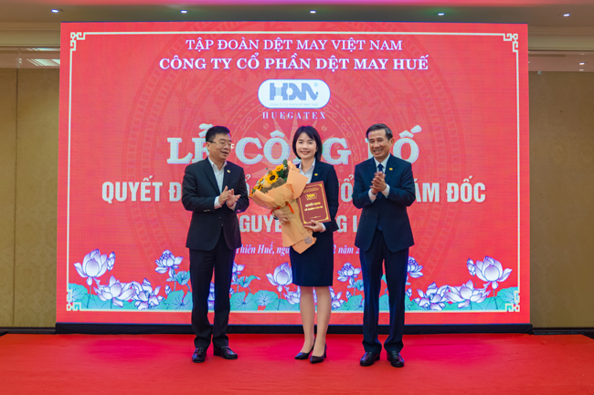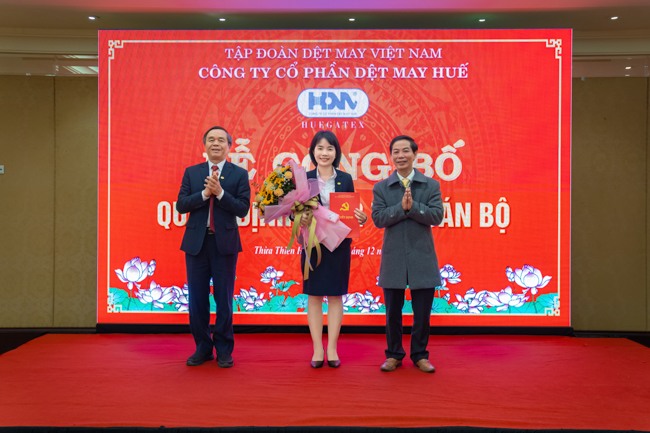 Ông Lê Tiến Trường – Chủ tịch HĐQT DMVN tặng hoa chúc mừng và Ông Nguyễn Đức Trị - Phó TGĐ Tập đoàn DMVN, Chủ tịch HĐQT Công ty trao quyết định bổ nhiệm Tổng Giám đốc Công ty CP Dệt May Huế cho Bà Nguyễn Hồng Liên