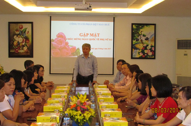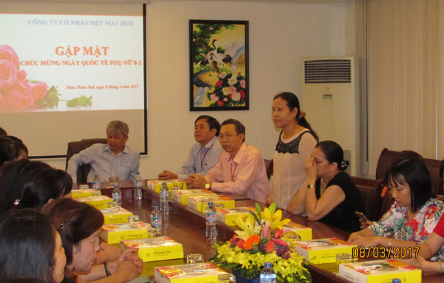 Nhân dịp kỷ niệm 106 năm ngày Quốc tế Phụ nữ, Công ty Cổ phần Dệt May Huế đã tổ chức buổi gặp mặt cán bộ nữ tiêu biểu chúc mừng ngày Quốc tế Phụ nữ 8/3. Đến dự buổi gặp mặt có ông Nguyễn Bá Quang – Chủ tịch HĐQT, Tổng Giám đốc, bà Trần Kim Oanh – Chủ tịch Công đoàn Công ty.
