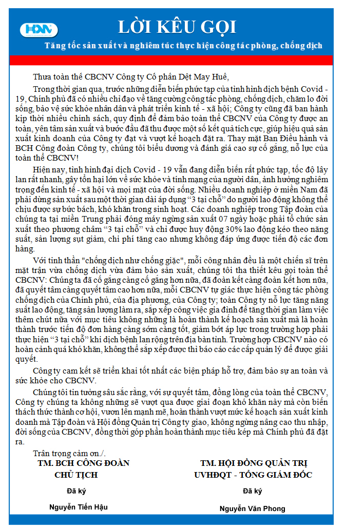 Với tinh thần "chống dịch như chống giặc", mỗi công nhân đều là một chiến sĩ trên mặt trận vừa chống dịch vừa đảm bảo sản xuất, chúng tôi tha thiết kêu gọi toàn thể CBCNV: Chúng ta đã cố gắng càng cố gắng hơn nữa, đã đoàn kết càng đoàn kết hơn nữa, đã quyết tâm càng quyết tâm cao hơn nữa, mỗi CBCNV tự giác thực hiện công tác phòng chống dịch của Chính phủ, của địa phương, của Công ty; toàn Công ty nỗ lực tăng năng suất lao động, tăng sản lượng làm ra, sắp xếp công việc gia đình để tăng thời gian làm việc thêm chút nữa với mục tiêu không những là hoàn thành kế hoạch sản xuất mà là hoàn thành trước tiến độ đơn hàng càng sớm càng tốt, giảm bớt áp lực trong trường hợp phải thực hiện “3 tại chỗ” khi dịch bệnh lan rộng trên địa bàn tỉnh. Trường hợp CBCNV nào có hoàn cảnh quá khó khăn, không thể sắp xếp được thì báo cáo các cấp quản lý để được giải quyết.