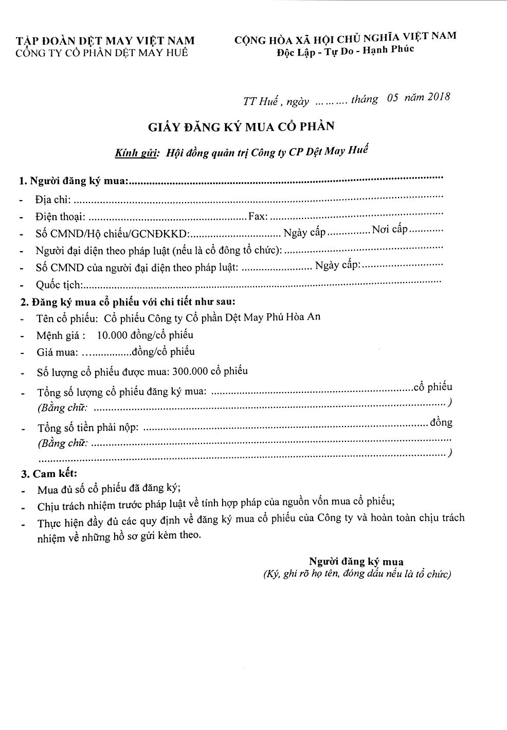 Công ty Cổ phần Dệt May Huế thông báo về việc chuyển nhượng cổ phần tại công ty cổ phần Dệt May Phú Hòa An